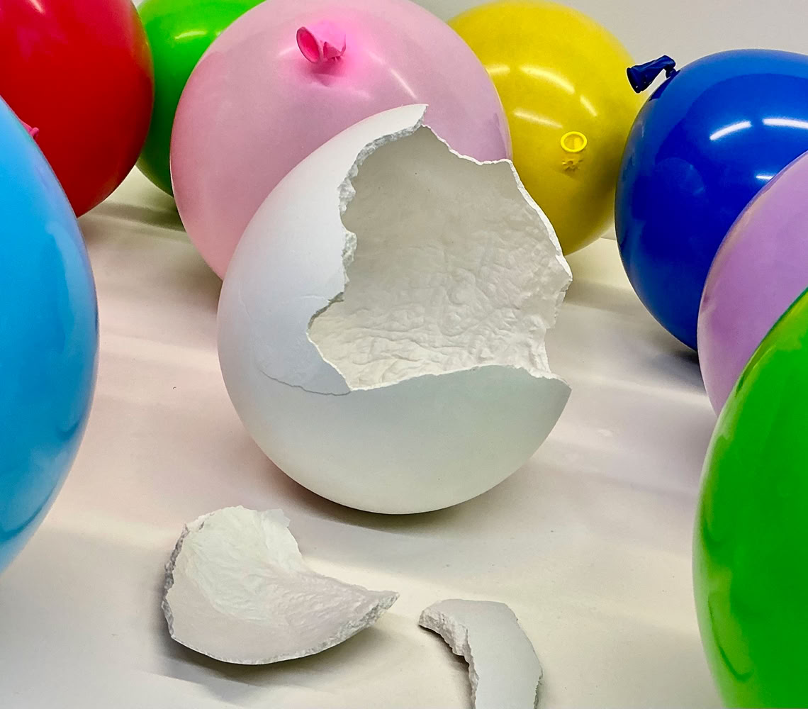 Des coquilles d’œuf en plâtre, moulées dans des ballons, sont disposées dans l’espace. Des traces de latex coloré, volontairement conservées, gardent la mémoire de l’enveloppe qui les a formées.