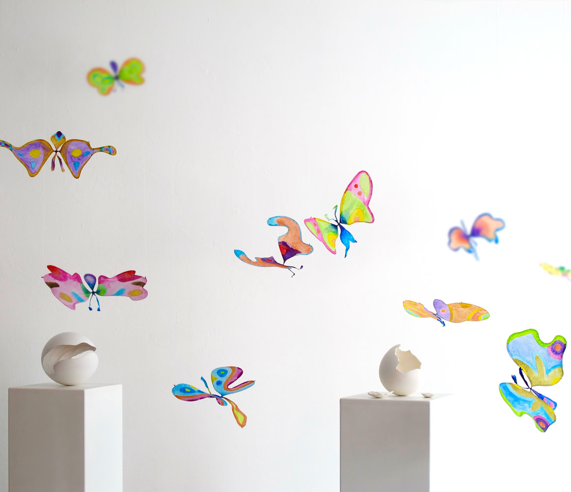 Au-dessus, dix-huit papillons construits en fil de métal et papier de soie peint flottent dans l’air.
