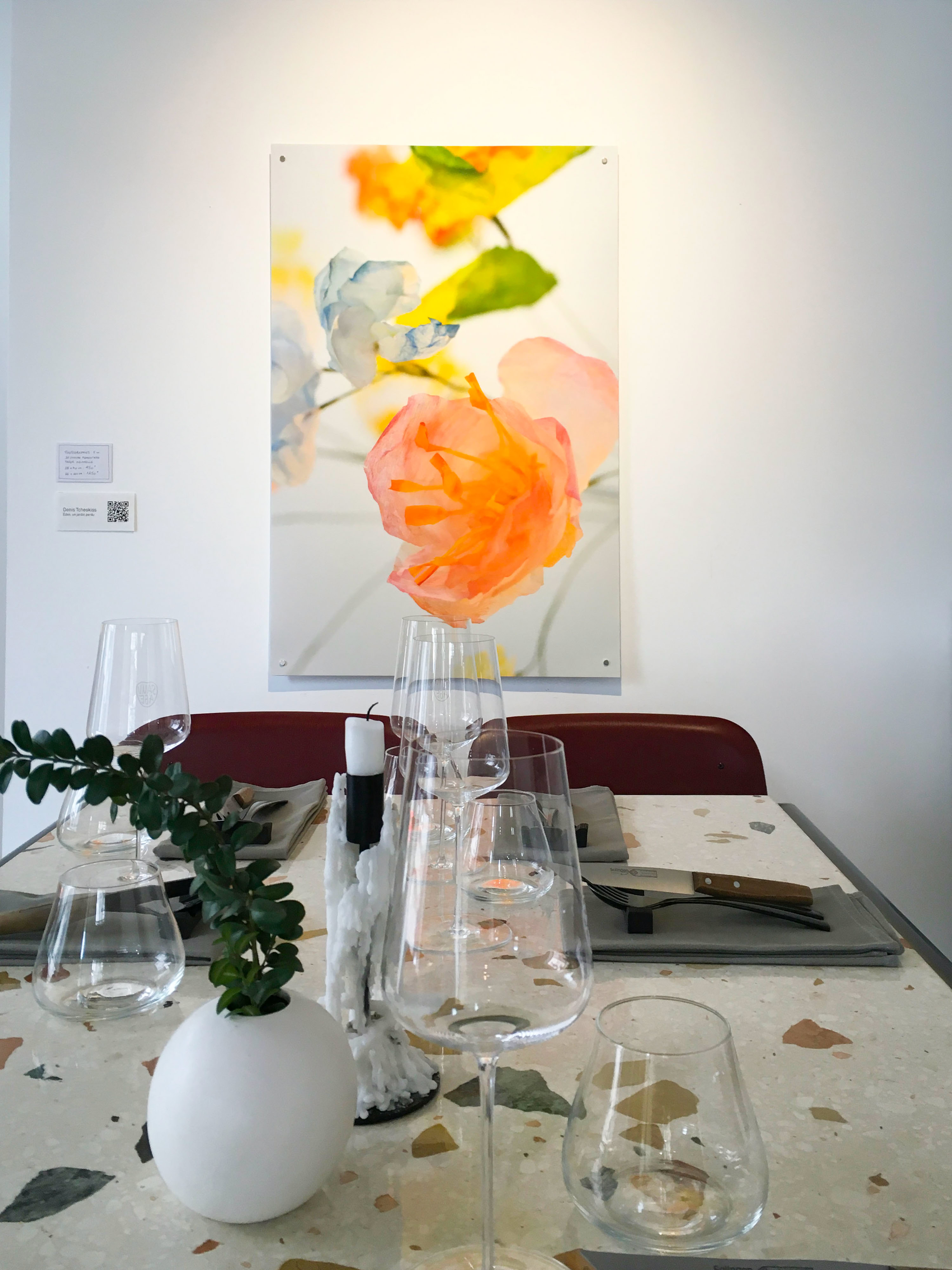 Les fleurs sont montées sur des tiges de métal gainées de papier et présentées sous l’apparence de bouquets aériens et multicolores, en équilibre précaire, offerts en hommage à la Nature.